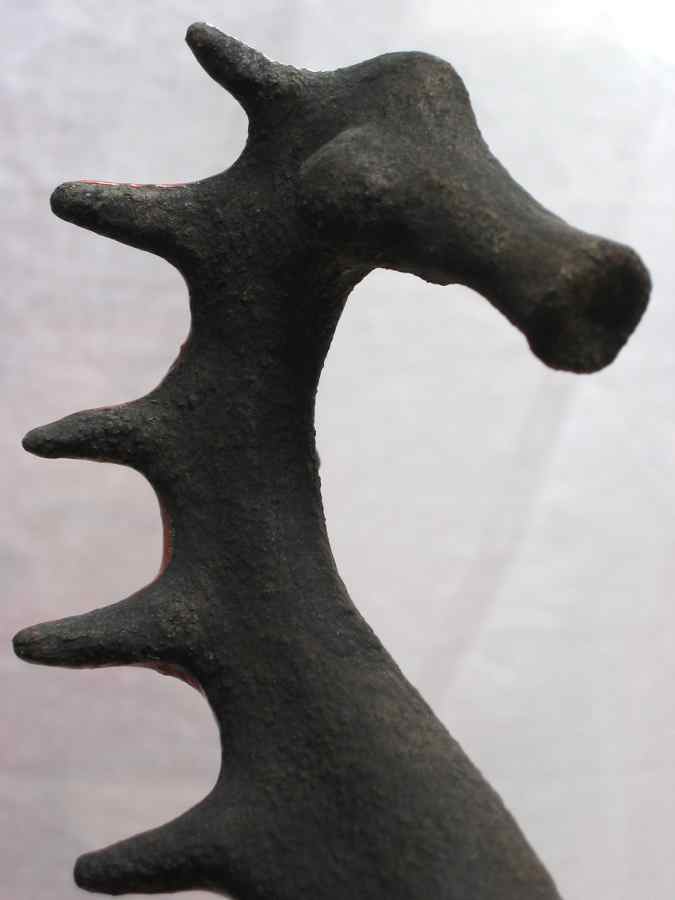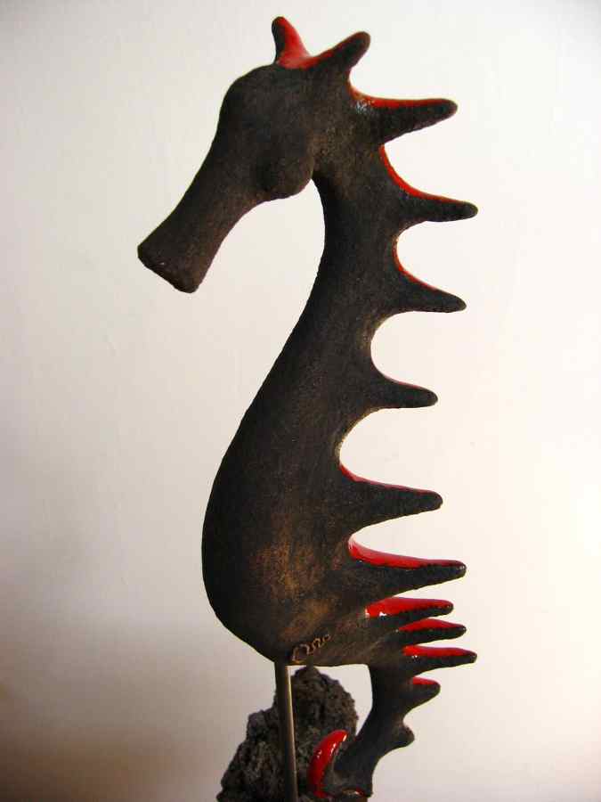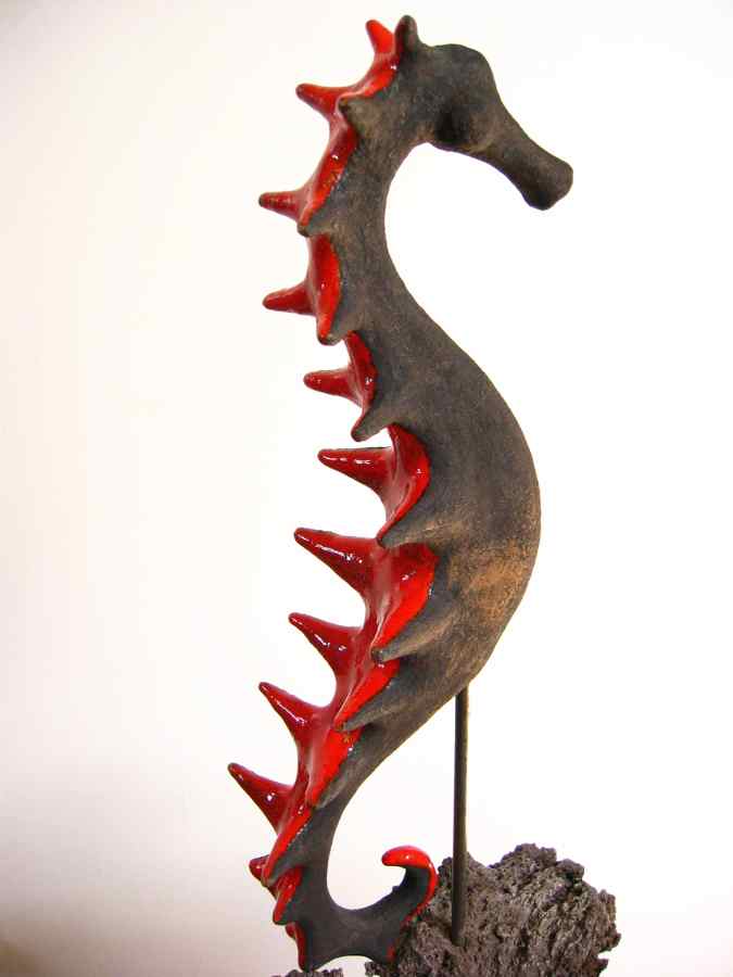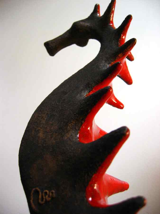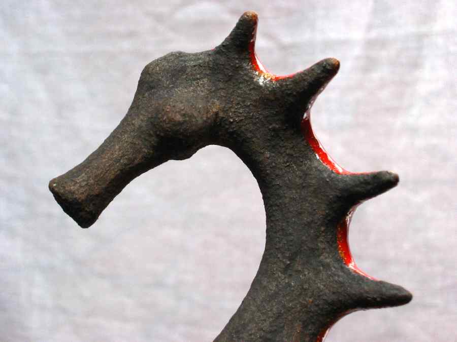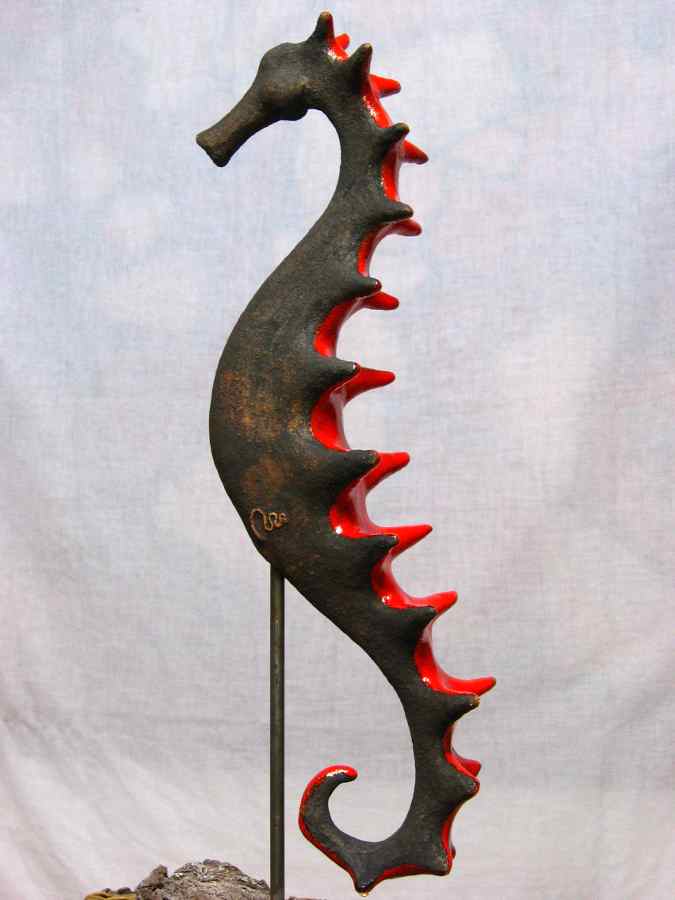 Pieza modelada en barro refractario 1280º, esmaltada en rojo 980º, sobre soporte de hierro