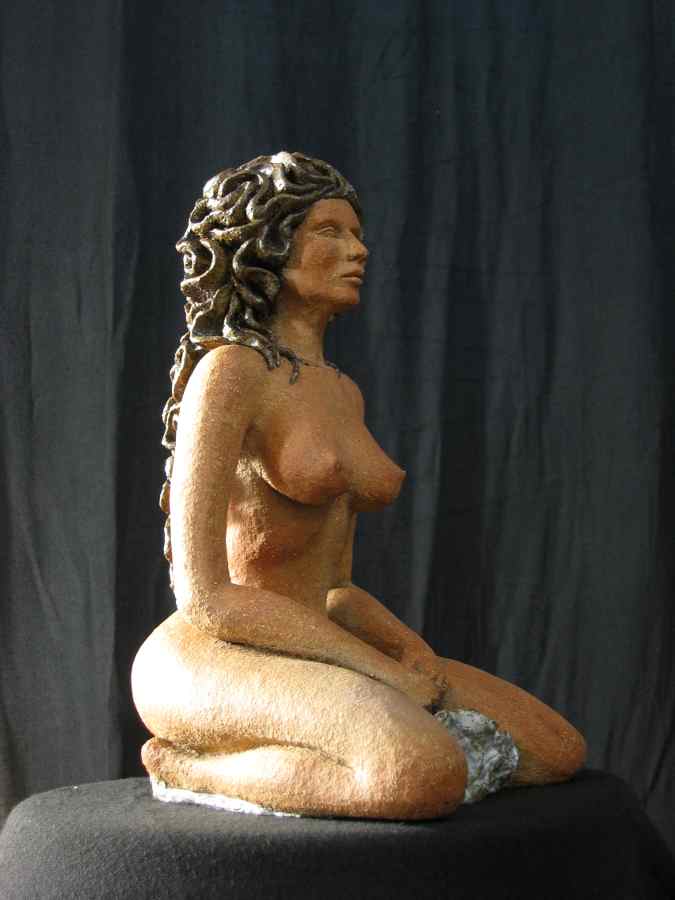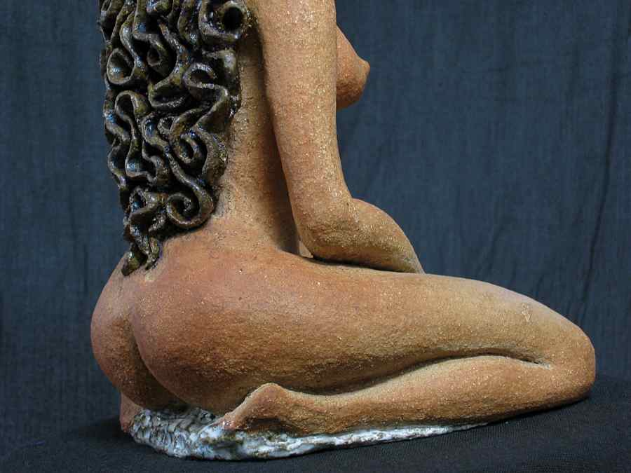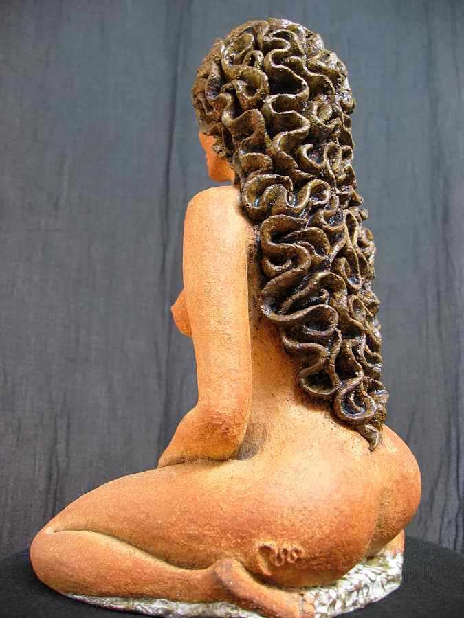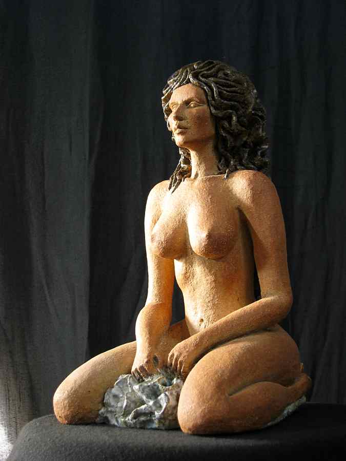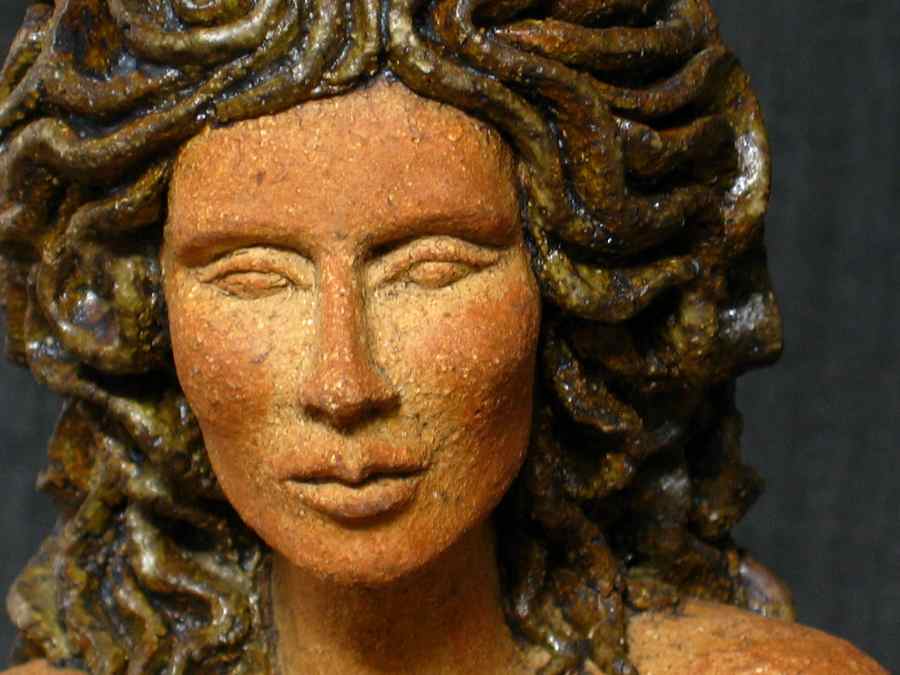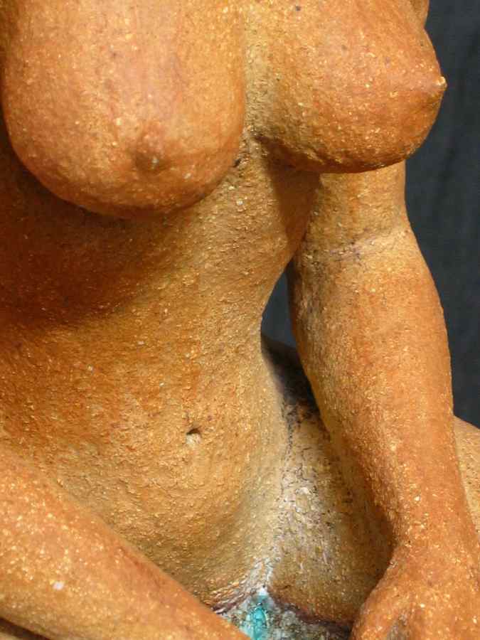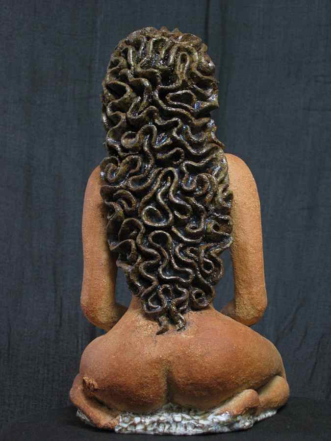 Escultura modelada en barro refractario, cubierta óxido manganeso, porcelana, vidrio y óxido cobre